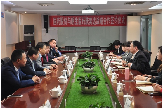 簽約儀式在國藥股份北京總部會議室隆重舉行。儀式上,朗生集團(tuán)執(zhí)行董事兼行政總裁劉幫民先生和國藥股份總經(jīng)理李志剛先生先后致辭,并就公司歷程、業(yè)務(wù)發(fā)展等方面做了詳盡介紹。會上雙方就膚美達(dá)的合作事項展開了熱烈討論,就雙方關(guān)心的話題進(jìn)行了細(xì)致溝通。